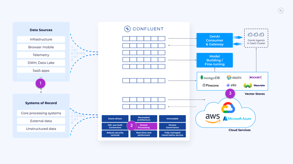 Si l’IA est au cœur de beaucoup de stratégies actuelles, elle n’est rien sans la data. Dans ce cadre, Confluent a lancé un projet nommé Data Streaming for AI à destination des entreprises pour créer des applications IA intégrant des données temps réel. Le spécialiste de services managés Apache Kafka met en avant son moteur de streaming de données pour élaborer des inférences contextuelles en temps réel à partir d’informations qualifiées et fiables. Ces inférences peuvent ensuite être transmises à des bases de données vectorielles ou à des applications IA.