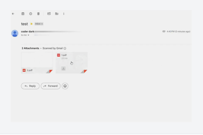 Boîte de réception Gmail montrant la pièce jointe PDF malveillante passant les analyses initiales. (crédit : Varonis)