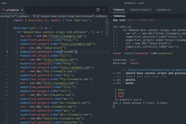Bun rend inutiles les outils Node.js comme node, npx, nodemon, dotenv ou cross-env », a expliqué l’équipe de Bun. La boîte à outil peut aussi exécuter des fichiers .js, .ts, .cjs, .mjs, .jsx et .tsx, et remplacer ainsi des compilateurs source à source (transpilers) comme tsc et babel. Pour les tests, Bun peut faire office d’exécuteur de tests compatible Jest. Il prend en charge les tests instantanés, la couverture de code et le mocking. Bun sert également de bundler JavaScript avec les meilleures performances de sa catégorie et d’API de plugin compatible esbuild. C’est aussi un gestionnaire de paquets compatible NPM.