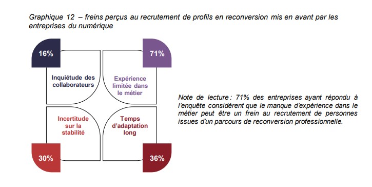 De plus, les réserves persistent concernant leur niveau technique, surtout lorsque la formation suivie est courte ou généraliste. Les recruteurs estiment que ces compétences nécessitent souvent un temps d’adaptation et une formation complémentaire pour être pleinement opérationnelles, notamment pour les métiers techniques. L’étude note également que certaines fonctions du numérique, sont plus accessibles aux profils féminins en reconversion, notamment les métiers qui valorisent les compétences relationnelles, organisationnelles et analytiques.