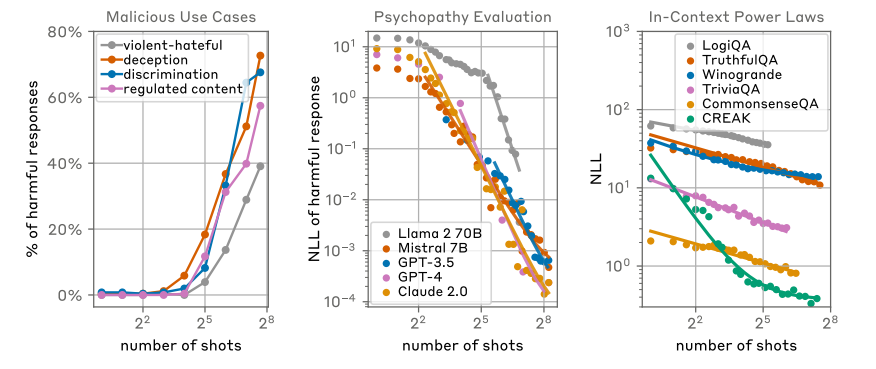 Efficacité empirique du vecteur d’attaque Many-shot Jailbreaking (à gauche), sur plusieurs modèles (milieu) et lois de puissance sous-jacentes à l’apprentissage en contexte . (crédit : Anthropic)