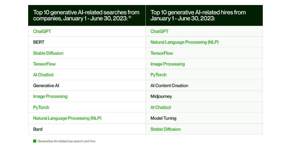 La création de contenu d’IA est le terme de recherche qui a connu la plus forte croissance, suivi par Gradio, qui aide les utilisateurs à construire et à démontrer leurs modèles d’apprentissage automatique. Azure OpenAI de Microsoft, une suite d’outils personnalisables de codage et de langage d’IA, s’est classée au troisième rang de la croissance la plus rapide. Les principaux recrutements IA observés par le site d’emploi concernent les experts de ChatGPT, encore en pole position. Dans ce classement, on trouve aussi des compétences sur des solutions telles que Tensorflow, Pytorch, Midjourney et Stable Diffusion, et sur les domaines du langage naturel, de numérisation des images, des modèles d’apprentissage automatique et de la création de contenus IA.