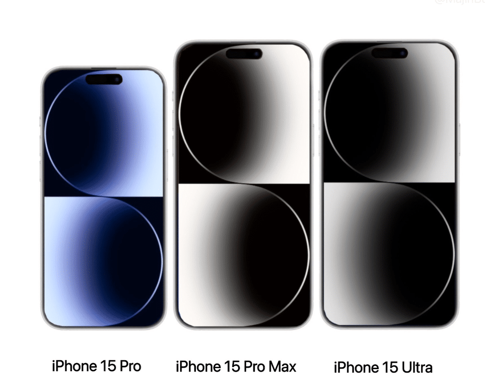 Comparaison prévisionnelle des tailles modèles Pro, Pro Max et Ultra de l’iPhone 15. (crédit : Majin Bu)