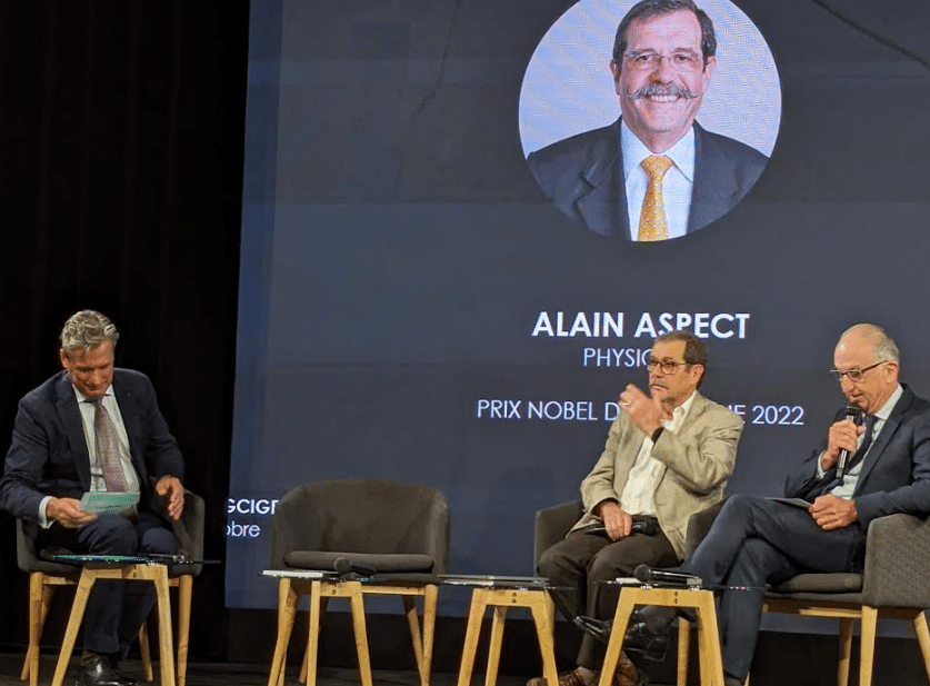 Le thème de la réunion publique faisant suite à la 53e assemblée générale du Cigref à Paris ce 11 octobre 2023 au Pavillion Gabriel tournait autour du « progrès ». L’occasion de mettre sous les feux des projecteurs Alain Aspect, physicien et Prix Nobel de Physique 2022 (au centre), pour ses « expériences avec des photons intriqués, établissant la violation des inégalités de Bell et ouvrant la voie à la science de l’information quantique ». A gauche, Henri d’Agrain (délégué général du Cigref) et à droite Jean-Michel André, (administrateur du Cigref et DSI du Groupe SEB). (crédit : D.F.)