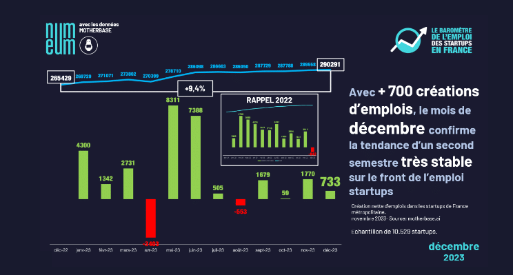 Dans son analyse, Numeum en note également des volumes de créations et de suppressions de postes quasi-équivalents en cette fin d’année. Sur le mois de décembre, plus de 1 800 jeunes pousses ont fait naître 3 650 emplois, et elles sont tout autant à avoir supprimé un peu plus de 2 900 postes. En moyenne sur le second semestre, ce sont un peu moins de 1 950 startups qui, chaque mois, créent des emplois et près de 2 050 startups qui en détruisent.