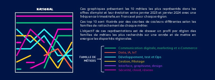 Après avoir publié un classement des formations et métiers IT les plus recherchés en France en 2023, la Grande école du numérique décline par régions son classement des 10 professions qui recrutent le plus dans l’informatique. L’objectif ? Dresser un profil des spécialités technologiques les plus recherchées sur une année en utilisant des courbes de couleur différentes selon les familles de rattachement de chaque profession. Les données analysées portent sur les offres d’emploi dans le numérique et leur évolution entre janvier 2023 et janvier 2024 en France et pour chaque région. Les familles étudiées sont les suivantes : communication digitale marketing/e-commerce, data/IA/IoT, développement/test/DevOps, gestion/pilotage, interface/graphisme/design et sécurité/cloud/réseaux.