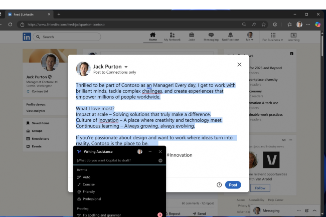 En parallèle, Microsoft expérimente « Universal Writing Assistant », un assistant rédactionnel qui se déclenche automatiquement sous forme de pop-up lorsqu’un utilisateur interagit avec un champ de texte dans un navigateur. Il pourra relire, corriger les erreurs et même reformuler des passages entiers. Pour l’instant, cette fonctionnalité reste réservée aux PC Copilot+, car elle exploite les capacités de calcul des NPU intégrés à ces machines.