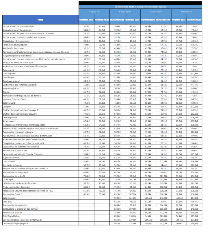 Dans son guide de référence 2024 sur les salaires IT, l’Etat a remplacé les plafonds par des fourchettes hautes et basses selon l’expérience des candidats (Cliquer ici pour agrandir l’image). Source Dinum.