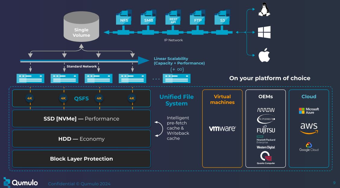 Débarrasser de ses appliances au profit d’un modèle purement logiciel en mode souscription, Qumulo se distingue avec des propositions aux tarifs compétitifs et taillées pour le cloud hybride.