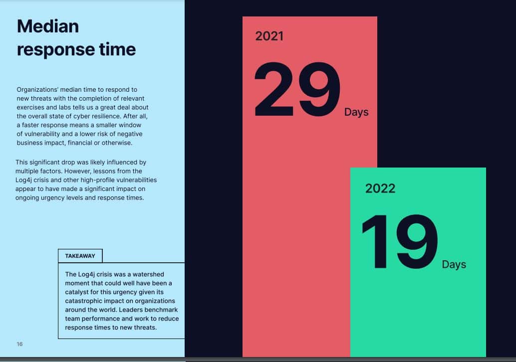D’après l’étude, il s’avère qu’en moyenne, le temps de réponse des entreprises aux cyberattaques s’est accéléré, glissant de 29 jours en 2021 à 19 en 2022, ce qui peut être attribué à l’urgence des délais de réactions rapides dans le contexte des retombées de la crise Log4j et d’autres vulnérabilités très médiatisées au cours de l’année écoulée. L’amélioration du temps médian des entreprises pour répondre aux menaces en dit long sur l’état général de la cyber-résilience, car un temps de réponse plus rapide signifie une plus petite fenêtre de vulnérabilité et un risque plus faible d’impact négatif sur l’entreprise. La crise Log4j, par exemple, a été un moment clé qui a servi de catalyseur à cette urgence compte tenu de son impact catastrophique. Bien que la découverte initiale de Log4j remonte à décembre 2021, elle continue d’être en tête des classements parmi les utilisateurs de la plate-forme Immersive Labs, car deux des cinq laboratoires CVE les plus fréquemment tentés au cours de l’année dernière étaient liés à Log4j.