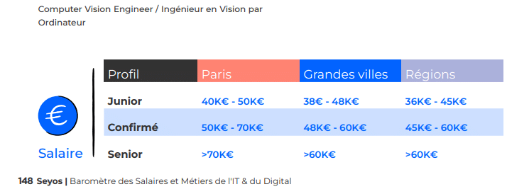 Dans les spécialités IA, l’ingénieur en computer vision est le mieux placé en termes de salaires. (Source: Seyos)