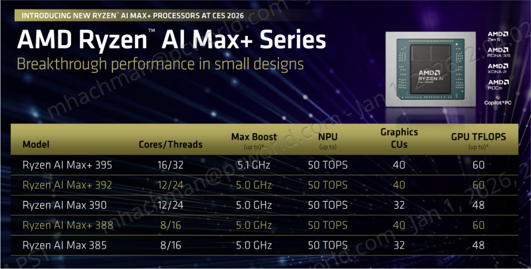 AMD ajoute les deux processeurs Ryzen AI Max+ 392 et Ryzen AI Max+ 388 à sa gamme Ryzen AI Max+ et intègre le Ryzen 7 9850X3D dans sa gamme de processeurs de jeu Ryzen 9000 X3D, afin d’offrir une alternative plus abordable, même si pour l’instant le fournisseur n’a pas divulgué le prix de ces puces. Il y a un an, AMD avait lancé le Ryzen AI Max+ (Strix Halo), une combinaison unique associant une quantité massive de cache SRAM de niveau 3 pour exécuter localement des charges de travail LLM à un moteur graphique robuste pour les jeux et un NPU pour les tâches IA. Les puces Ryzen AI Max+ ont fait leurs débuts dans les ordinateurs portables et les tablettes, ainsi que dans des mini-PC comme le Framework Desktop, où elles ont fait des éclats. AMD pourrait remporter davantage de contrats grâce à sa gamme de puces pour ordinateurs portables Ryzen AI 300, mais la gamme Ryzen AI Max a notamment séduit Acer, Asus, HP et Lenovo. Les Ryzen AI Max+ d’AMD offrent des alternatives plus puissantes : d’une part, elles conservent les 60 AI TOPS (Tera Operations Per Second) du processeur dédié à l’IA et elles offrent les mêmes 40 unités de calcul (CU) graphiques que la puce Ryzen AI Max+ 395 haut de gamme existante.