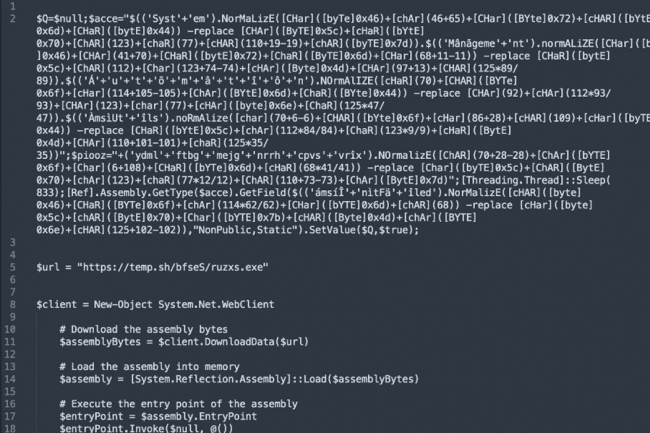 Les courriels de phishing analysés par Alien Labs et d’autres chercheurs, dont Igal Lytzki de Microsoft, utilisaient une technique de détournement de thread pour diriger les utilisateurs vers une page d’hameçonnage, laquelle finissait par déposer un fichier JavaScript (.js) sur les ordinateurs des utilisateurs. Une fois ouvert dans le bloc-notes, le script faisait apparaître un grand nombre de mots anglais aléatoires commentés. Par le passé, dans le cadre d’autres campagnes, des chercheurs ont également signalé des variantes du script avec des caractères sanskrits. Le script est fortement obfusqué par des fonctions qui cachent et extraient le code malveillant réel de différentes parties du fichier. Son objectif est de télécharger la charge utile de deuxième étape à partir d’une URL, elle-même codée à l’aide d’un chiffrement personnalisé et de valeurs décimales au lieu de caractères ASCII.