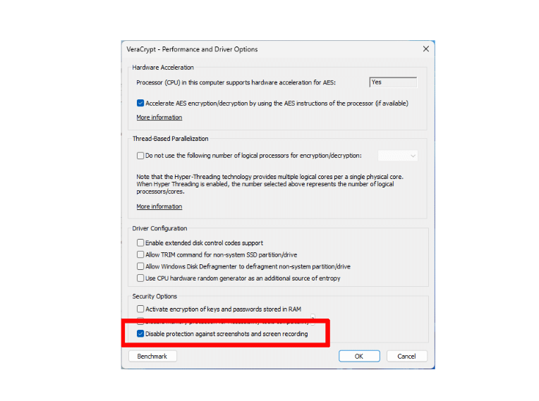 Si l’on veut une capture d’écran de Veracrypt, il est nécessaire de désactiver au préalable cette protection. Pour ce faire, il faut cliquer sur « Performances et options du pilote » (Performance and Driver Options) dans le menu « Paramètres » et cocher la case de la rubrique « Désactiver la protection contre les captures d’écran et l’enregistrement d’écran » (Disable protection against screenshots and screen recording). Confirmer la mise en garde et la note de redémarrage en cliquant sur OK. Ensuite, fermer la fenêtre avec OK, puis redémarrer Windows et relancer Veracrypt pour la prise en compte des nouveaux paramètres.